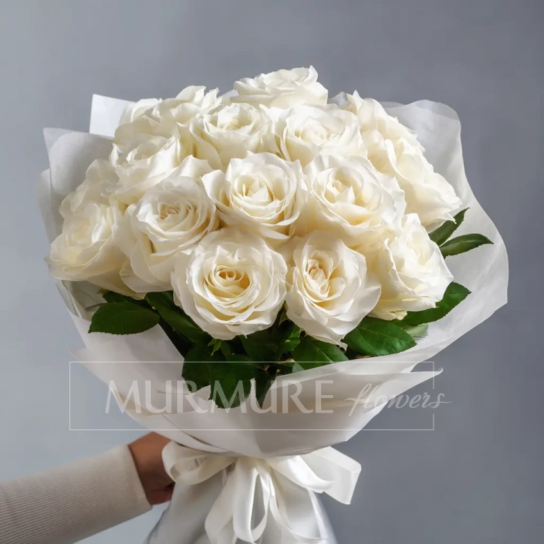 Изысканный букет из белых роз, словно пропитанный молочной мягкостью. Идеален для признания в уважении, благодарности или для подарка на утро свадьбы. Белые розы подчеркивают чистоту и деликатность момента.