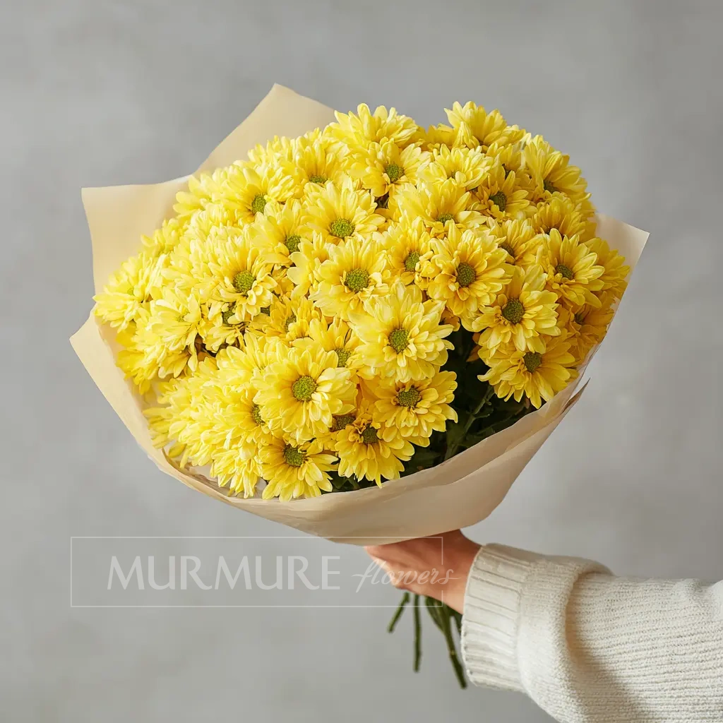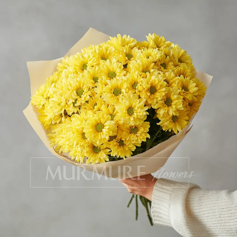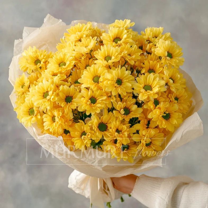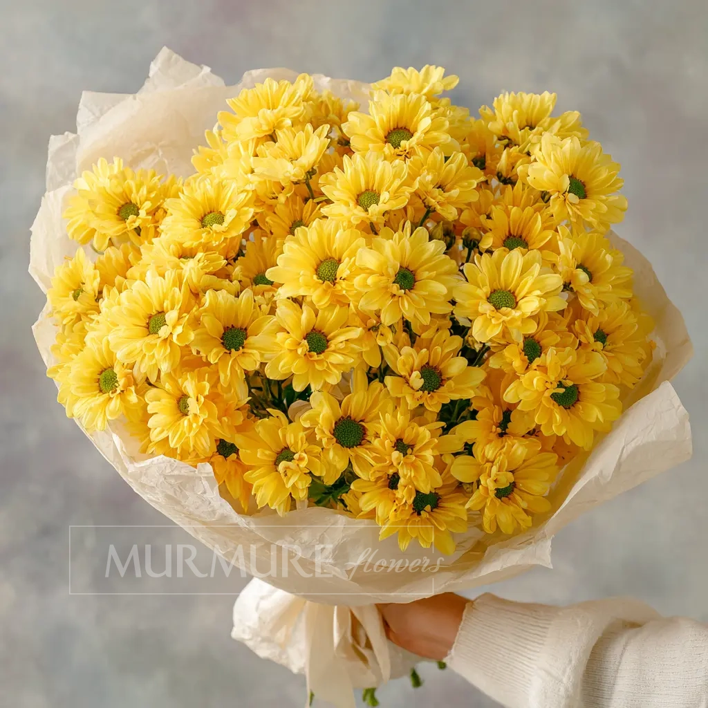 Яркий и солнечный букет, наполненный жизнерадостной энергией. Кустовые хризантемы образуют пышную и живую форму — отличное решение для доброго утреннего подарка или поздравления друга.