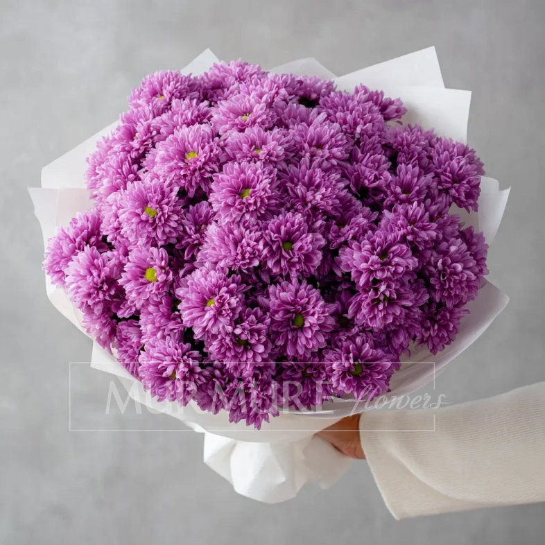 Нежность и загадочность — главные ноты этого букета. Сиреневые хризантемы подойдут для романтичного подарка, акцента на чувствах или комплимента с тонким намёком.