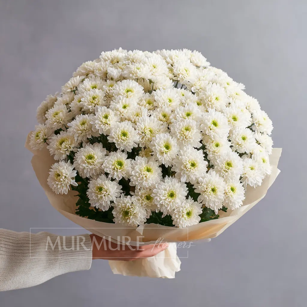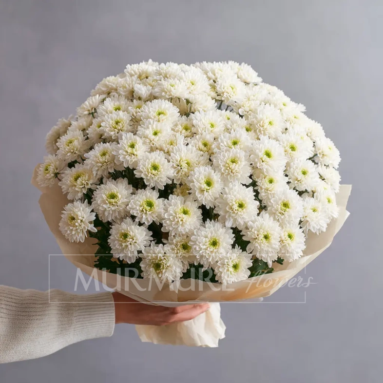 Классический букет из белых кустовых хризантем. Подойдёт для офиса, поздравлений, свиданий и просто — чтобы сделать день ярче.