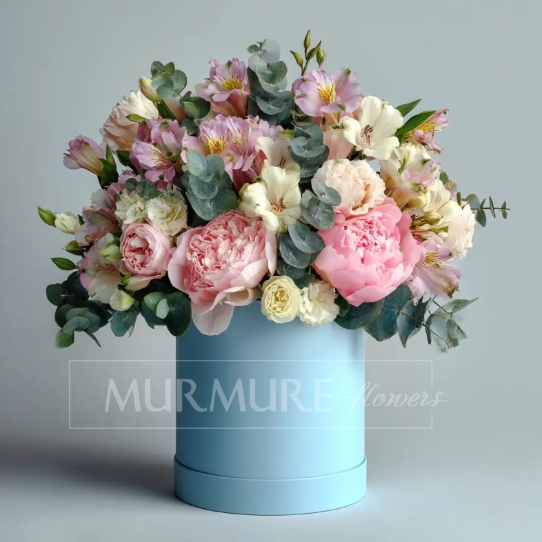 Свежие пионы, альстромерия и эвкалипт создают ощущение летнего утра. Ароматная и легкая композиция для уютных моментов и особых случаев.