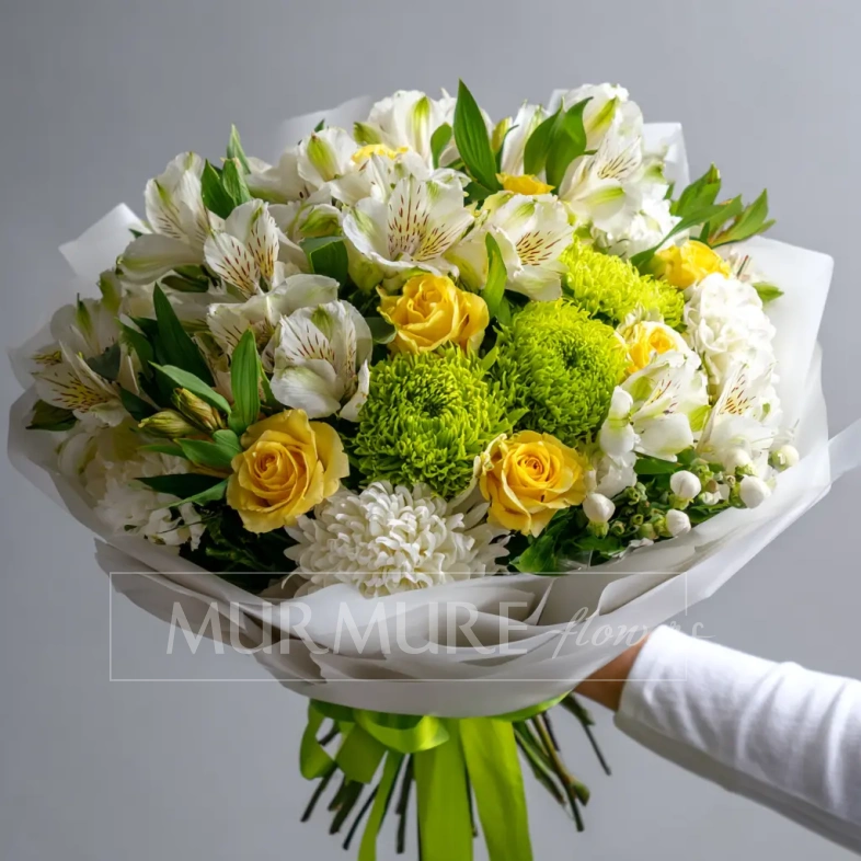 Композиция, как летняя песня — наполнена мягкими красками, теплом и светом. Альстромерии добавляют воздушности и утончённости. Универсальное решение для поздравления женщины или девушки.