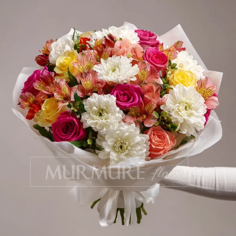 Эффектный букет, в котором альстромерии раскрываются во всей палитре. Яркие, насыщенные краски привлекают внимание и создают праздничную атмосферу. Идеален для запоминающегося сюрприза.