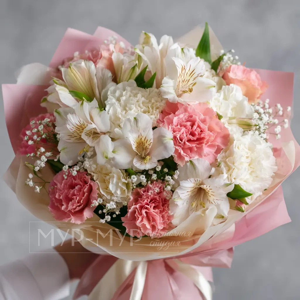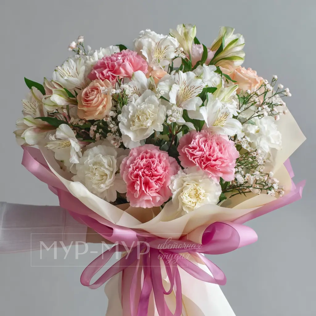 Букет с французскими розами и гвоздиками «Розовые облака»