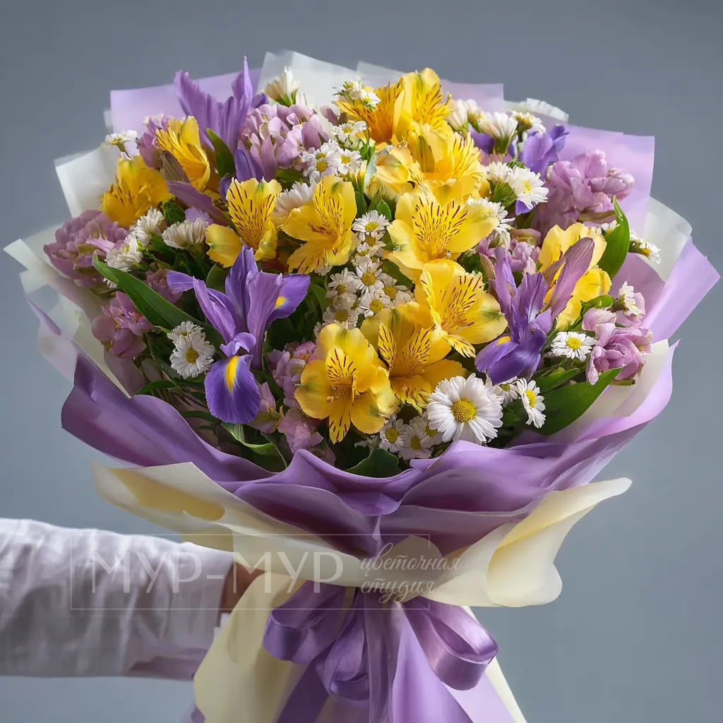 Композиция в жёлто-фиолетовой гамме — как всплеск света в пасмурный день. Альстромерии создают ощущение тепла и оптимизма. Прекрасно подойдёт для поднятия настроения или неожиданного подарка.