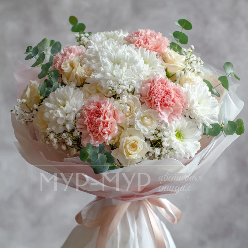 Букет из пионовидных роз и гвоздик «Маршмэллоу»