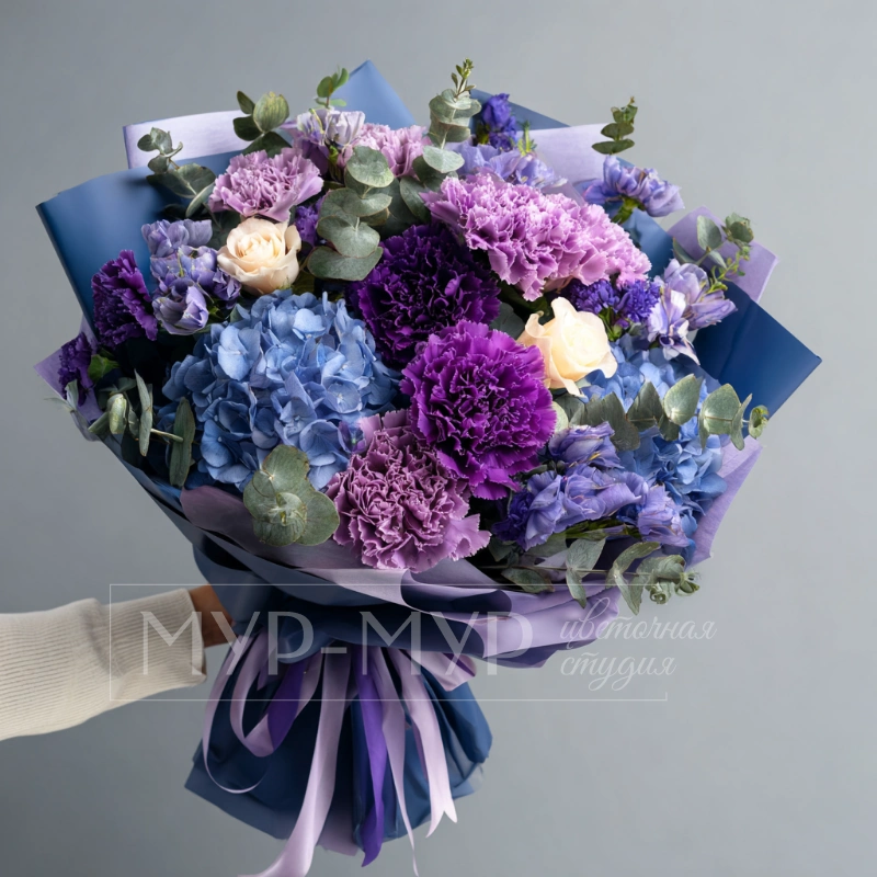 Фиолетово-сиреневые гвоздики в сочетании с гортензиями переливаются, как ночное небо. Отлично подойдет для романтического вечера.
