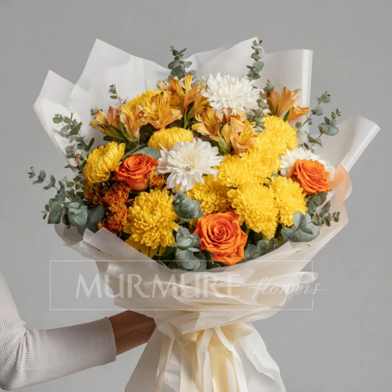 Тёплый и уютный букет, в котором собраны самые насыщенные оттенки осени — от желтого до золотистого. Хризантемы дарят атмосферу уюта и мягкого света, как октябрьский закат. Подходит для поздравлений и осеннего настроения.
