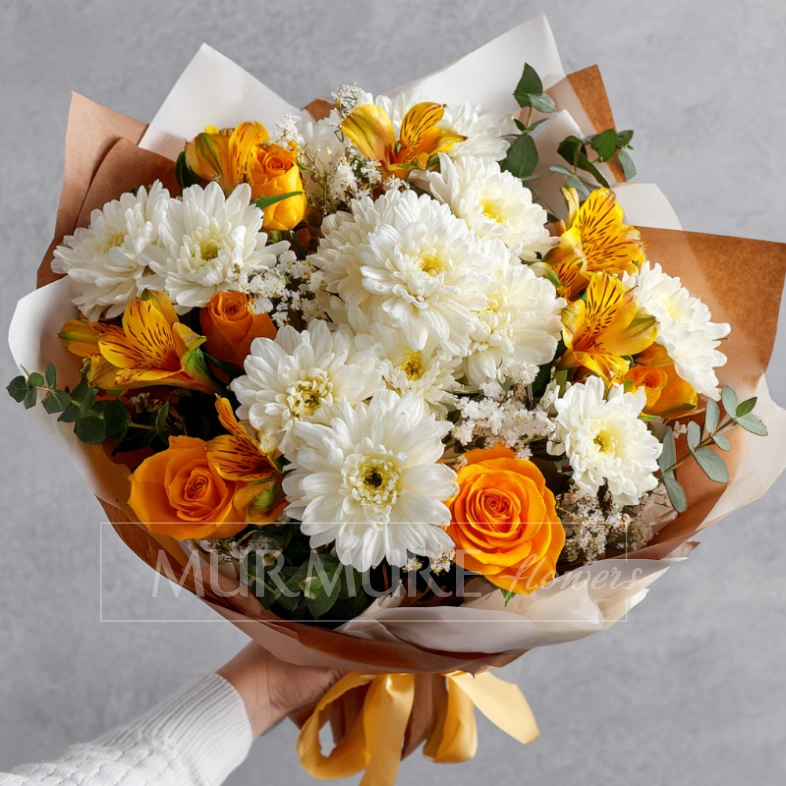 Художественная композиция, где каждая хризантема звучит своей нотой. Букет с характером, гармонией и стилем. Подойдёт для подарков учителям, коллегам или любимым.