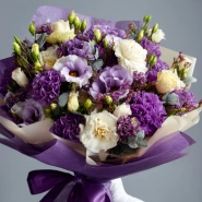 Лёгкий и воздушный букет, в котором переплетаются хрупкие эустомы и пышные гвоздики. Их сиреневые оттенки создают ощущение волшебства и нежности. Отличный выбор для признания в чувствах или создания праздничного настроения.