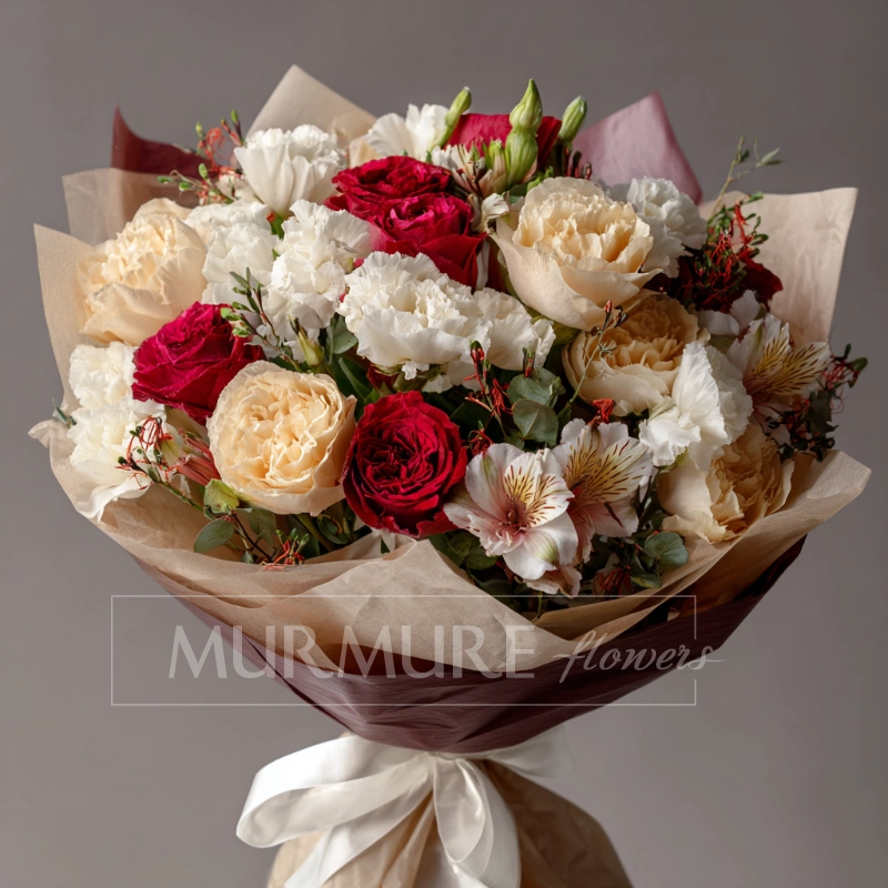Изысканная композиция на грани сдержанности и утончённости. Эустомы передают хрупкость момента и деликатность жеста. Подходит для подарка тем, кого ценишь и уважаешь.