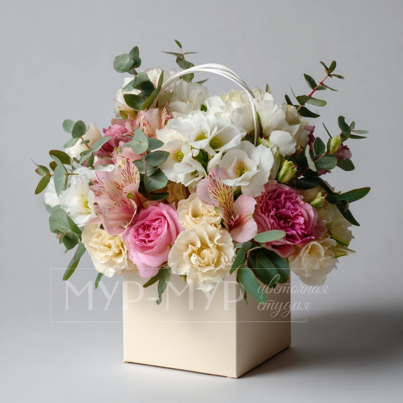 Французский шарм и нотки флористической романтики. Композиция изысканная и очаровательная — отличный вариант для утончённого подарка.