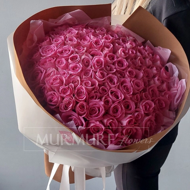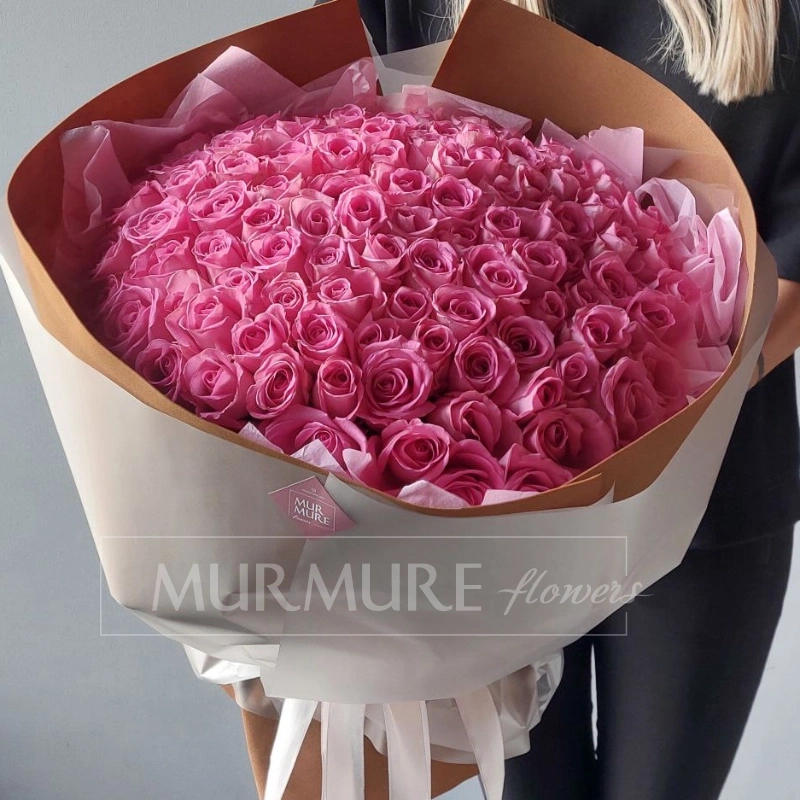 Этот роскошный букет, состоящий из множества розовых роз, уложенных в пышную круглую композицию, станет идеальным подарком для самых дорогих и близких людей. Розы разных оттенков розового цвета придают букету объем и глубину, создавая эффект нежности и элегантности. Букет из роз символизирует любовь, нежность, восхищение и благодарность, что делает его универсальным выбором для любого торжественного случая.