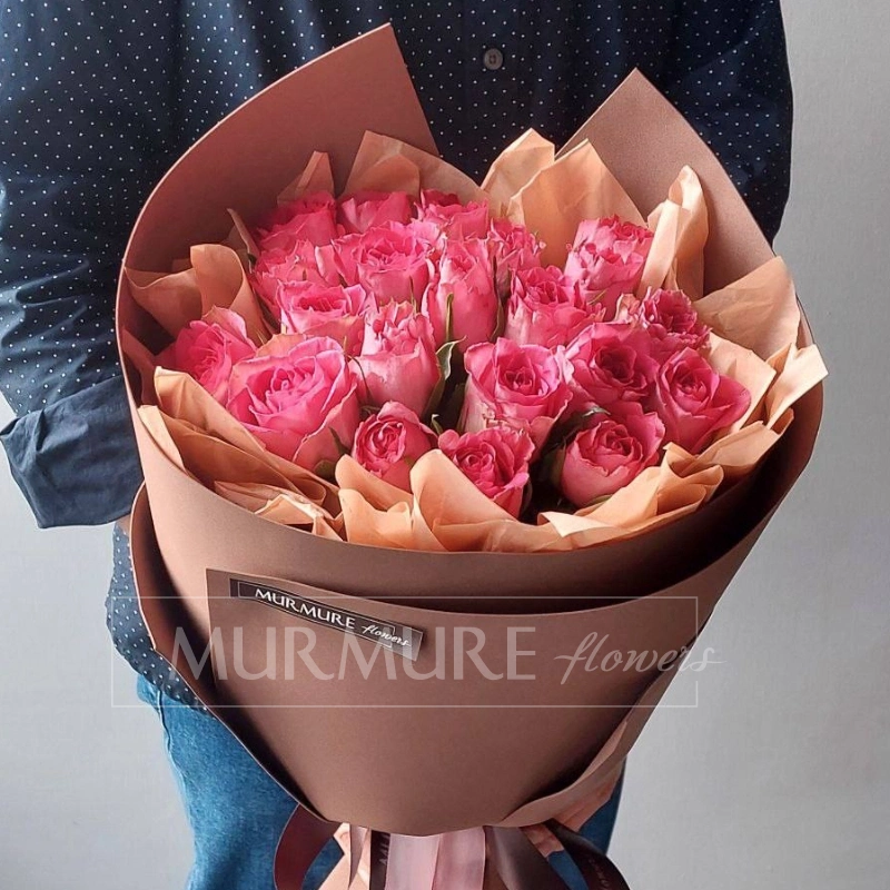 Букет из ярких розовых роз, упакованный в коричневую бумагу с атласными лентами, создаёт романтичный и трогательный образ. Нежные оттенки роз и изысканная подача делают композицию идеальной для выражения чувств и создания праздничной атмосферы. Этот букет станет прекрасным подарком для самых дорогих и близких.