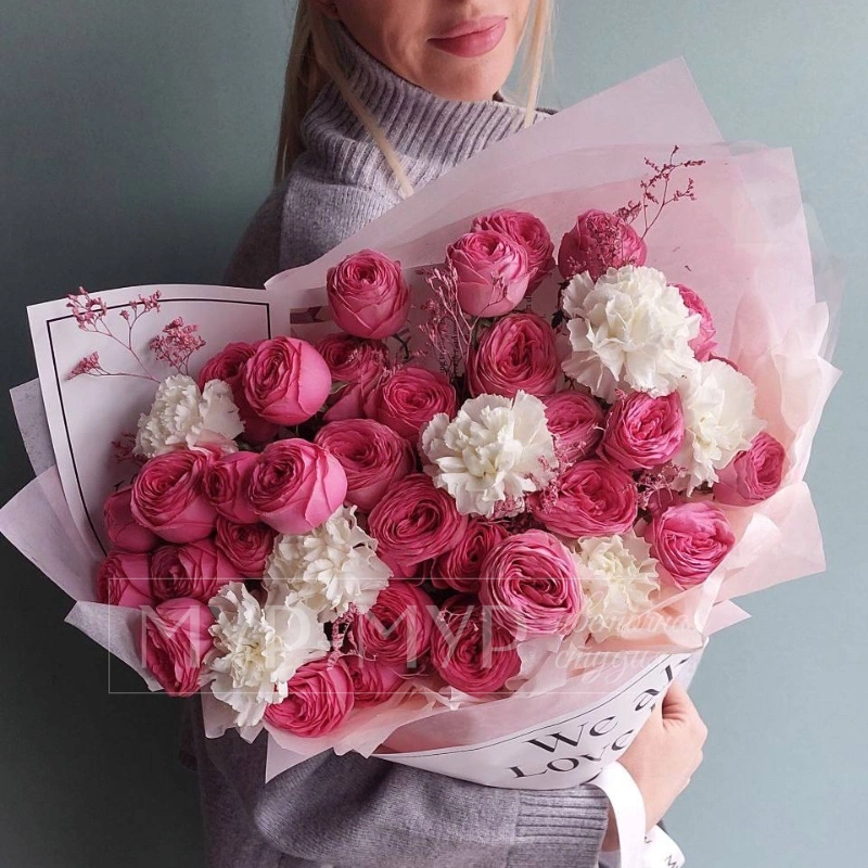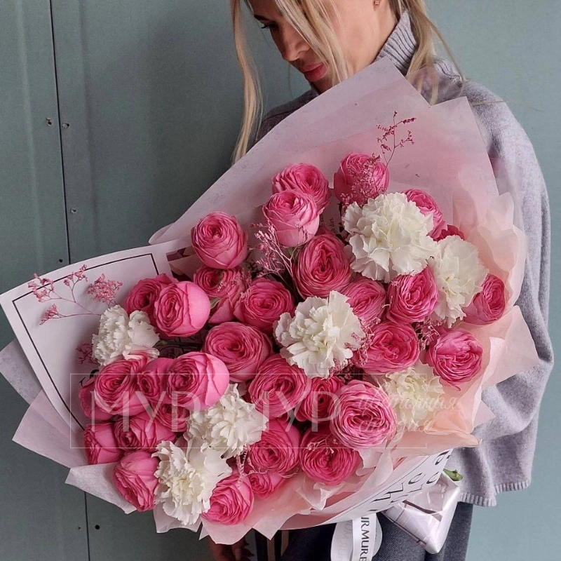 Букет из пионовидных роз и гвоздик «Маршмэллоу»