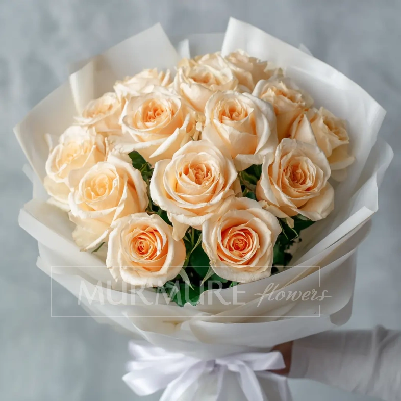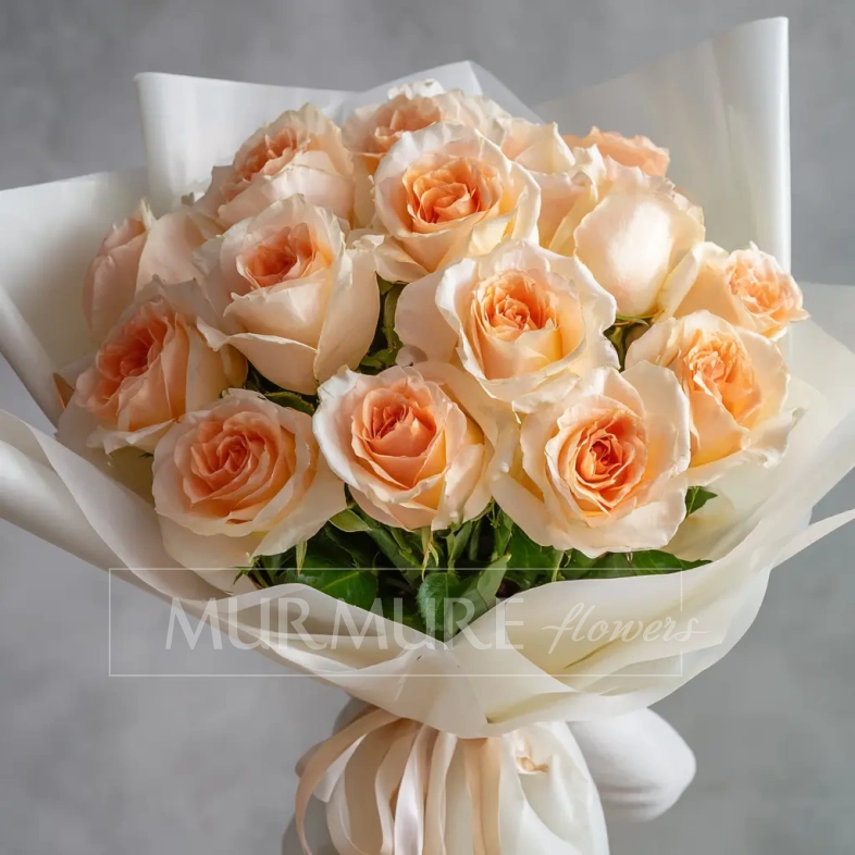 Мягкий, пастельный букет из 15 персиковых эквадорских роз подойдёт для изысканного подарка на день рождения, юбилей или свадебную годовщину. Персиковый цвет — символ благодарности и тёплого отношения.