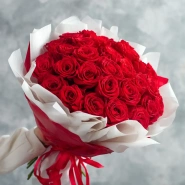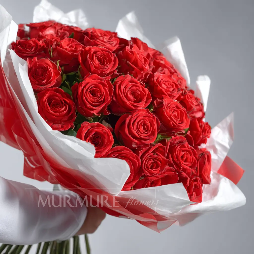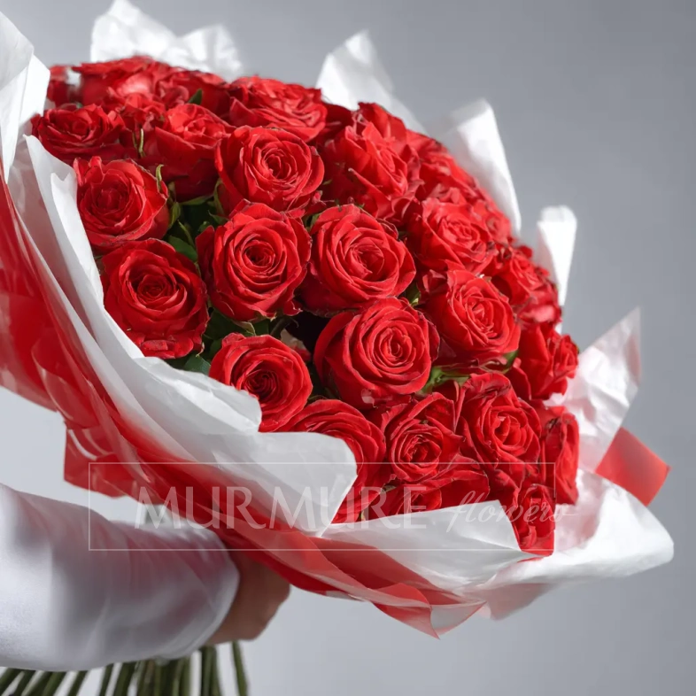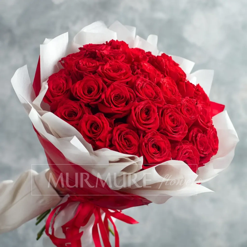Элегантная композиция с насыщенными, карминовыми оттенками. Для женщин с характером и чувством стиля. Букет подчеркнёт уверенность дарителя и важность момента.
